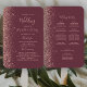 Cet élégant ventilateur moderne de programme de mariage dispose d'un arrière - plan bordeaux foncé bordé d'une fausse parties scintillant rose en or. Le texte apparaît dans l'élégante écriture rose rose et les polices de caractères cuivre.