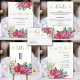 Simple et moderne, la suite Faire-part de mariage dispose d'un superbe script cursif en or avec des embellissements cardiaques. Bouquet floral aquarelle avec rose, magenta, rose chaud, fleurs rose clair, verdure et frondes de palmiers tan.