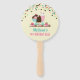 Un ventilateur personnalisé de la main de bain avec un thème de crème glacée. Des confettis colorés au sommet. Illustré avec un bar à crème glacée au chocolat, un sundae à 3 boulettes avec une cerise sur le dessus, et un flotteur à fraise avec de la crème fouettée. Petites fraises et cerises. Arrière - plan jaune pâle. Rafraîchissant, gourmandises chaudes en été.