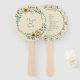 Ce beau éventail à main présente une bordure extérieure avec une couronne de tournesols et d'eucalyptus. Personnalisez avec les noms de la mariée et du marié. Au verso se trouve un motif floral de tournesol autour du bord. Vous personnalisez le dos avec le programme de votre mariage ainsi que la date.