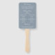 Ventilateur de main du programme de mariage moderne avec un design simple avec vos noms dans un élégant script manuscrit en haut à gauche et vos détails mariages en alignement droit en bas à droite, sur votre photo préférée. Le côté arrière a votre ordre de cérémonie, de mariage et de remerciement message en blanc sur un arrière - plan bleu poussiéreux. Le design minimaliste est agrémenté d'une touche romantique grâce au lettrage à la main chic.