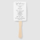 Ventilateur à main élégant et moderne du programme de mariage avec écriture manuscrite. Le programme énumère les informations de la cérémonie, message de remerciement, et les membres de la fête de mariage.