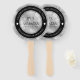 Fêtez le 10e anniversaire de mariage avec ces fans de main commémoratifs! Elégante lettrage serif noir et blanc avec des confettis hexagonaux sur un arrière - plan de feuille d'étain ajouter une touche mémorable pour cette occasion spéciale et jalon. Customisez les noms des heureux couples, les années de mariage et les messages de félicitations pour leur anniversaire de naissance. Design © W.H. Sim. Voir plus sur zazzle.com/expressionsoccasions
