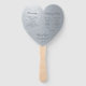 Un ventilateur de programme de mariage simple mais élégant en forme de coeur. Les titres et les noms (et les initiales) de la mariée et du marié sont écrits dans un élégant script calligraphique, le reste en casquette. L'arrière - plan est faux argenté (gris métallique), le texte est gris foncé. A l'arrière, il a sur le côté gauche le programme de cérémonie mariage et, sur le côté droit, la fête de mariage (avec 2 colonnes différentes pour l'équipe mariée et l'équipe mariée). et sous eux un court message Merci.