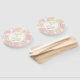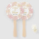 Ventilateur rond feuille rose et or mariage. Il présente des feuilles de Fromage Leaf Philodendron (Monstera deliciosa) ou de Fromage Suisse Plante et feuilles de palme en rose vif avec contour d'or. Votre libellé est dans un cadre blanc avec contour doré.
