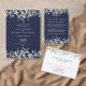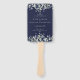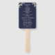 An elegant wedding program hand fan featuring pretty lilac floral greenery and your wedding details set in classic, elegant text on a navy blue background. Designed by Thisisnotme©