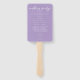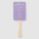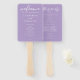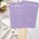 Ce magnifique programme de mariage lilas éventail main dispose d'une belle typographie blanche sur un arrière - plan mauve doux pour une cérémonie de printemps dans l'après-midi. Le pastel de la lavande est un choix délicat de couleurs pour un élégant jardin.