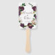 Belle couronne fleurie, ventilateurs à main mariage. Élégantes fleurs blanches de prune et d'ivoire, vertes vertes et dorées. L'arrière comprend un arrière - plan couleur prune violet solide et des lignes de texte blanc pour une liste détaillée de la fête de mariage.