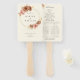 Programme de ventilateur à la main avec une couronne de style moderne avec des roses aquarellés dans un thème de couleur champagne, marron chocolat et rose roux. Faux couronne d'or et feuillage d'or. Veuillez noter que les détails en relief doré sont une imitation, pas une feuille d'or.
