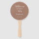 Programme du jour de mariage imprimé sur un ventilateur à main de style rond qui présente un arrière - plan de couleur mocha marron tendance sur le côté avant avec les noms des mariés et mariés en blanc, stylisé. Le verso du programme répertorie les participants à la fête de mariage et les rites de cérémonie sur un arrière - plan blanc avec des lettres gris foncé. Modifiez le ventilateur de main et remplacez les informations du programme de mariage par les vôtres. Parfait pour une cérémonie de mariage à l'intérieur ou à l'extérieur ! Sélectionnez le nombre de programmes de ventilateur à main désiré.