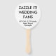 Éventails personnalisés imprimés sur mesure 5,75" PADDLE ECRU (lots de 10) Modèle vierge. Concevez, créez, réalisez le vôtre. Votre photo de mariage, image, message, texte, noms des mariés, logo, graphiques, en impression couleur entièrement personnalisée sur les deux faces de l'éventail. Diamètre 5,75". Disponibles en carton blanc et écru (personnalisable dans n'importe quelle couleur). Assemblage simple requis - poignées en bois et 4 points de colle par éventail inclus (disponibles pré-assemblés moyennant un supplément). Disponibles en forme ronde, cœur, palette ou rectangle.