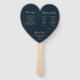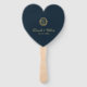 Un élégant ventilateur de programme de mariage en forme de coeur pour un thème marine et mariage d'or. Les titres et les noms (et les initiales) de la mariée et du marié sont écrits dans un élégant script calligraphique, le reste en casquette. L'arrière - plan est bleu marine, le texte est jaune doré. Sur le devant, au-dessus du texte, il y a un monogramme dans une couronne vintage de feuilles d'or. A l'arrière, il a sur le côté gauche le programme de cérémonie mariage et, sur le côté droit, la fête de mariage (avec 2 colonnes différentes pour l'équipe mariée et l'équipe mariée). et sous eux un court message Merci. La couronne vintage avec ses élégantes décorations feuilles d'or sur bleu marine est tirée d'une couverture de livre vintage, par T. J. Cobden-Sanderson (1840-1922), pour The Capital par Karl Marx; publié en 1884, maintenant dans le domaine public. Le livre appartenait à l'artiste William Morris.