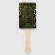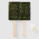 This elegant, modern wedding program fan features an olive green agate background trimmed with gold faux glitter. The text appears in gold-colored handwriting and copperplate fonts.
