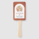 Feuilles de palmiers séchés tropicaux, pampas herbe et protéa fleurs terre cuite arche botanique mariage programme de ventilateur main. Ce joli design mariage dispose d'un cadre en arc sur arrière - plan taché de terre cuite. Dans le cadre il y a un bouquet de feuilles de palmiers séchés, des fleurs de protéa et de l'herbe de pampas.