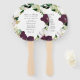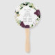 Élégant programme de mariage floral éventail main avec vos noms encerclés par la couronne de fleurs de prune foncé violet et blanc à l'aquarelle avec feuille d'or faux rose et feuilles verts. Personnalisez les fans du programme de mariage floral en ajoutant la date et l'emplacement de votre mariage, l'ordre des événements et la fête de mariage au dos. Conçu pour coordonner avec notre collection de mariages floraux de prune foncée.