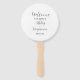 Programme de cérémonie de mariage sur un ventilateur de style rond qui présente un arrière - plan blanc avec les noms de mariée et de mariée et la date sur le côté avant du ventilateur, ainsi que le script gris foncé, stylisé listant les participants à la fête de mariage et cérémonies à l'arrière du ventilateur. Modifiez le ventilateur de main et remplacez les noms et les informations par vos propres informations de programme de mariage. Idéal pour un mariage extérieur en été ! Sélectionnez le nombre de ventilateurs de mains désirés.