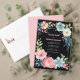 Programme de mariage floral vintage à l'aquarelle avec un design de fleurs enroulées autour d'un cadre, avec des couleurs rose, bleu, vert et un fond noir. Très joli et mignon.