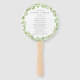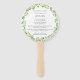 Éventail de programme de mariage rustique avec vos informations à l'intérieur d'une couronne composée de feuilles d'olive vertes. Vos informations sont dans une police gris moyen. Le devant comporte les événements de votre cérémonie et le dos votre cortège de mariage. Les éventails à main sont parfaits pour un mariage en plein air en été.