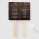 Programme de cérémonie de mariage/ordre de service éventails à la main dans un bois rustique brun foncé avec texte couleur crème. Ces éventails comprennent le programme de la cérémonie ainsi que les noms des parents de la mariée et du marié, l'officiant, le cortège nuptial et les autres participants. Contactez-nous pour obtenir de l'aide sur la personnalisation ou les produits correspondants.