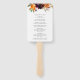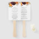 Éventail de mariage bohème rustique avec un bouquet floral peint à l'aquarelle dans des tons chauds et terreux d'orange brûlé, de terre cuite et de bordeaux profond, accompagné de verdure. Ce programme élégant aux riches tons d'automne est idéal pour un mariage d'automne.