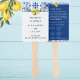 Ajoutez une touche de charme méditerranéen à votre journée spéciale avec ce ventilateur italien personnalisé de programme de mariage, magnifiquement conçu pour garder vos invités cool pendant votre cérémonie de mariage sur le thème de l'été. Doté d'une bordure en tuiles italiennes bleues et blanches classiques, de citrons jaunes vibrants et d'une police bleu marine chic contre un arrière - plan blanc immaculé, ce ventilateur allie élégance rustique et charme d'inspiration agrumes. Un gardien élégant et fonctionnel, ce passionné de programme de mariage méditerranéen est idéal pour une fête ensoleillée remplie de beauté italienne intemporelle.