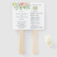 Éventails de mariage élégants avec programme floral et une bordure supérieure de verdure et de fleurs aquarelles en rose, pêche, lavande, blanc et bleu. Ces éventails de mariage fourniront à vos invités l'ordre du service et sont parfaits pour un mariage de printemps.