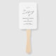Éventail à main de programme de mariage simple avec "le mariage de" en calligraphie ainsi que vos détails de mariage en noir et blanc. Le verso contient votre ordre de cérémonie, cortège de mariage et message de remerciement. Un design minimaliste avec une typographie chic pour une touche élégante.