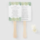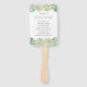 Éventails de mariage botaniques avec une bordure supérieure et inférieure constituée de succulentes à l'aquarelle verte sur le devant et une bordure supérieure au dos. Vos détails sont dans une police de caractères gris doux. Ajoutez les événements de votre cérémonie au recto et votre cortège de mariage et votre message de remerciement facultatif au verso. Ces éventails aideront à garder vos invités au frais lors d'un mariage en plein air et leur fourniront l'ordre du service. Ceux-ci font également un excellent souvenir et sont parfaits pour un mariage dans le désert au printemps ou en été.