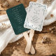 Les tons émeraude vibrants apportent une élégance fraîche et intemporelle à cet éventail de programme de mariage français vintage, parfait pour une célébration raffinée et romantique. Le design est encadré par un cadre floral chinoiserie gracieux, présentant une œuvre d'art florale complexe inspirée de l'illustration botanique victorienne et des motifs classiques de toile de Jouy. Idéal pour un mariage classique ou un mariage romantique, cet éventail de mariage élégant allie beauté et fonctionnalité tout en se coordonnant parfaitement avec votre suite de papeterie complète.