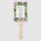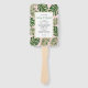 Ventilateur de la main du programme de mariage feuille rose vert et or. Il présente des feuilles de Fromage Leaf Philodendron (Monstera deliciosa) ou de Fromage Suisse Plante et feuilles de palmiers en vert avec contour or sur rose roux. Votre libellé est dans un cadre blanc avec contour doré.