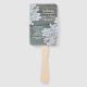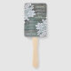 Ventilateur à main du programme de mariage rustique bleu grange et dentelle.