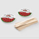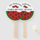 Tranches de pastèque rouge mûre, tropicale, mûre, mignonne, avec une bouchée sur arrière - plan blanc. Grande tranche en bas, et deux petites tranches entre le texte. Modèle de nom de famille en haut, et texte "Réunion de famille" au-dessus d'une grande tranche de pastèque. Le design est à l'avant et à l'arrière.