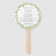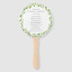 Ventilateur manuel rustique du programme de mariage avec vos détails à l'intérieur d'une couronne composée de feuilles d'oliviers verts. Vos détails sont dans une police gris moyen. Le front a vos cérémonies et le dos a votre fête de mariage. Les ventilateurs sont parfaits pour un mariage extérieur d'été.