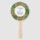 Ventilateur à main rustique feuille vert et or mariage rond. Il présente des feuilles de Fromage Leaf Philodendron (Monstera deliciosa) ou de Fromage Suisse Plante et feuilles de palme en vert avec contour or sur papier kraft. Votre libellé est dans un cadre blanc avec contour doré.