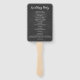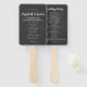 Un ventilateur simple mais élégant pour le programme de mariage qui complètera n'importe quel thème d'événement ou décor mariage. L'Arrière - plan est un effet de tableau noir gris foncé. Quelle excellente façon de combiner votre programme de mariage avec une faveur de mariage pratique pour les journées chaudes d'été.