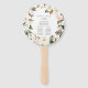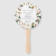 Élégant programme de mariage floral éventail main avec vos noms encerclés par la couronne de magnolias blancs, roses roses rousses, fleurs de coton et feuilles verts. Personnalisez les fans du programme de mariage floral en ajoutant la date et l'emplacement de votre mariage, l'ordre des événements et la fête de mariage au dos. Conçu pour coordonner avec notre collection de mariage Watercolor Magnolias.