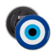 Evil Eye Blue Mati nazar symbole ouvre-bouteille design. Bleu mati grec / symbole turc pour la protection et bonne chance. Pratique pour la maison, la fête ou le bureau. Un ouvre-boîte magnétique rond avec des cercles.