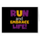 Si vous aimez courir, courir 5Ks, 10Ks, demi-marathons ou marathons, vous adorerez ce texte coloré en violet et jaune qui lit Run and Embrace Life! Courez et Embrace Vie T-shirts, sweat - shirts à capuche, magnets, boutons, cartes, autocollants, porte - clés, et beaucoup d'autres articles pour les coureurs qui aiment un design de course brillant et coloré!
