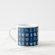 Tasse d'Expresso comportant la conception d'échecs avec des pièces d'échecs d'obscurité et de lumière dans les rangées sur un arrière - plan bleu.