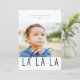 Élégante typographie "fa la la", carte photo de vacances. Le dos de la carte comporte un faux cadre de motif de pois en feuille d'or avec des lignes modèles pour votre message et vos noms personnalisés.