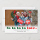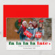 Avez-vous oublié d'envoyer votre carte de Noël à temps? Fa la la la late est la carte parfaite pour ceux qui sont toujours un peu en retard. Le recto de la carte présente la phrase «Fa La La Late» dans les couleurs indiquées, ainsi que votre photo et votre message personnalisés. Vous pouvez modifier toutes les couleurs de ce design amusant et simple à l'aide de l'outil de personnalisation.