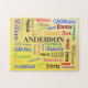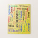Nom de famille modifiable Word Cloud. Espace pour un NOM DE FAMILLE et quatre prénoms. Les polices sont variées et l'arrière - plan est un dégradé d'agrumes jaune.