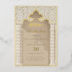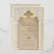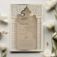 Commencez le voyage vers votre jour spécial avec cette invitation "Save the Date" exquise, capturant l'essence de la beauté architecturale islamique. Un magnifique portail, accentué par un travail de défilement élaboré et un emblème de calligraphie classique, crée un point focal majestueux, tandis que des colonnes à chevrons encadrent le design dans des tons subtils de crème et de taupe. Conçu dans une palette de couleurs allant du sable à l'ivoire, cette carte reflète une esthétique raffinée. Le papier texturé ajoute de la profondeur, laissant entrevoir l'événement luxueux à venir. Envoyez un premier aperçu de votre mariage qui soit aussi mémorable et intemporel que le jour lui-même.