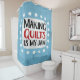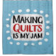 "Making Quilts Is My Jam" est un design de texte mignon en bleu avec du texte en noir et rouge, avec une forme d'accent blanc et des points blancs texturés blancs qui l'entourent.