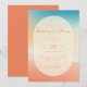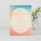 Cette élégante invitation de mariage présente un cadre circulaire aux contours adoucis posé sur un fond dégradé passant d'un pêche chaud à un bleu ciel frais. Le design utilise un mélange de polices de caractères script et serif, créant une mise en page sophistiquée mais invitante qui met en valeur les noms et les détails clés. Avec ses effets d'aquarelle et ses motifs discrets, l'invitation dégage une atmosphère sereine et formelle, parfaite pour célébrer une union spéciale. Les éléments personnalisables permettent une personnalisation tout en conservant une esthétique classique, ce qui en fait un choix idéal pour les couples recherchant un look intemporel et raffiné pour leur grand jour.
