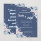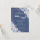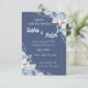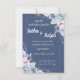 Ceci est une invitation de mariage avec un thème floral sophistiqué sur fond bleu atténué. Le design est orné de fleurs roses et blanches douces avec des accents dorés, lui donnant une touche romantique et élégante. Les polices de caractères script et serif ajoutent une sensation formelle mais personnelle.