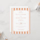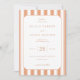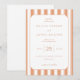 Cette élégante invitation de mariage présente un design classique avec des bordures rayées verticales pêche et blanc encadrant un panneau central couleur crème. La mise en page est épurée et sophistiquée, utilisant un mélange de polices serif grasses pour les noms et la date, complétées par un script cursif délicat pour un charme supplémentaire. La palette de couleurs chaudes et la typographie raffinée créent une atmosphère invitante, parfaite pour célébrer une union spéciale. Les éléments personnalisables permettent une personnalisation des noms, dates et lieu, ce qui en fait l'idéal pour les couples recherchant un look intemporel et formel pour leur grand jour.