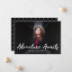Annonces de fin d'études branchées présentant la photo horizontale du diplômé avec "Adventure Await" en lettres manuscrites blanches. Personnalisez le devant de l'annonce d'obtention de diplôme d'Adventure Await en ajoutant le nom du diplômé, le nom de l'école et l'année de fin d'études. La faire-part s'inverse pour afficher un élégant motif en treillis noir et blanc.