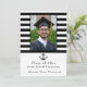 Un Faire-part de graduation à rayures noir et blanc nautique moderne avec un cadre sur votre choix de photo. Le côté arrière contient une autre photo et plus de détails sur votre diplômé.