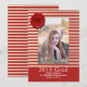 Faire-part photo de graduation rouge et or en rouge, couleur or et blanc rayé motif, avec un rouge solide, à travers le fond. Des images d'un sceau de cire rouge avec l'impression du casquette d'un mortier, décorent le haut à gauche de la photo. Personnalisez l'image avec la photo de votre grand. Le texte blanc est entièrement personnalisé et prêt à être personnalisé pour lire ce que vous voulez. Photo du détenteur de la place du modèle avec l'aimable autorisation de Lorri Lang.